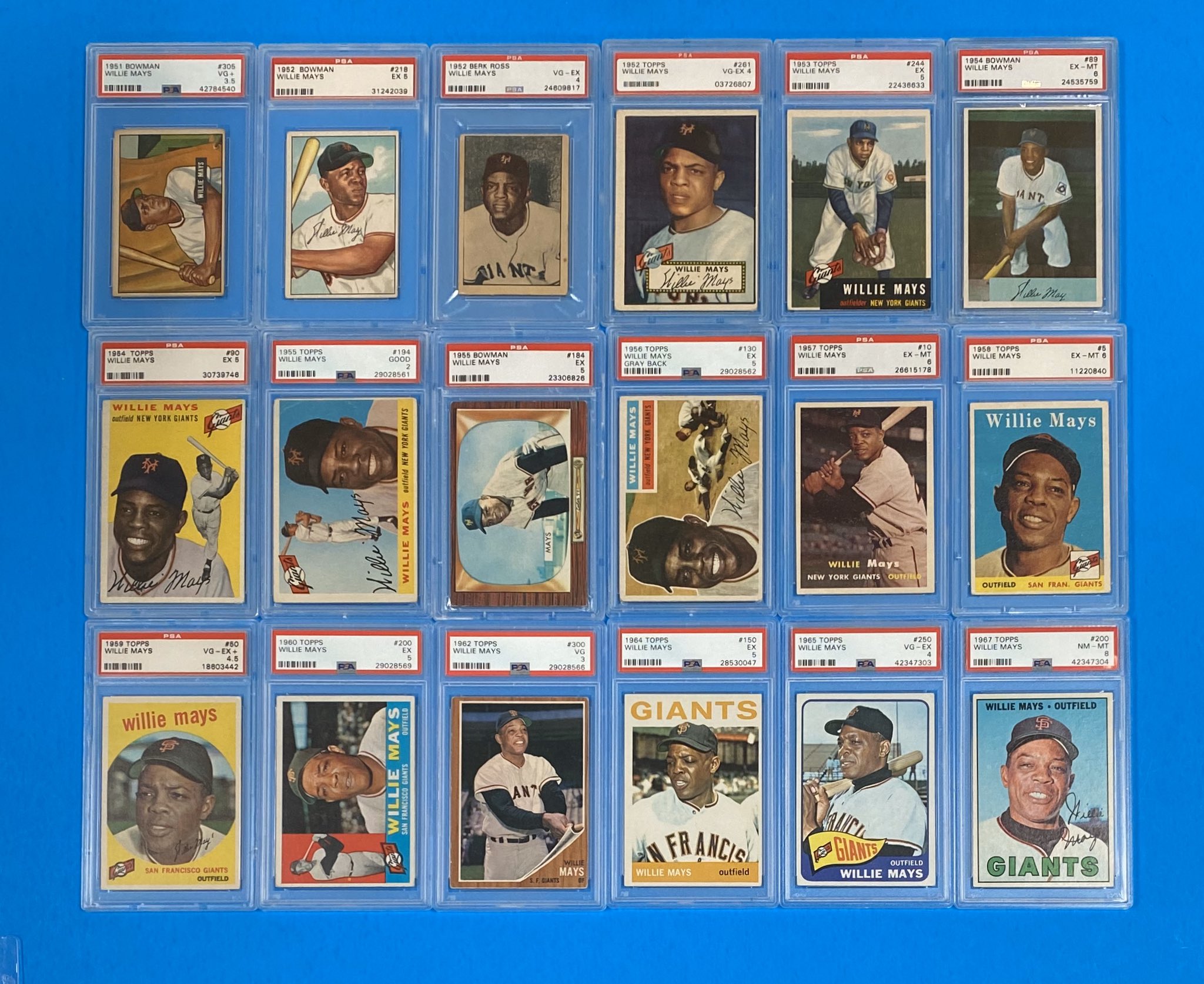 Stunning collection of Willie Mays cards put together by a passionate San Franciso collector after a lifelong journey of collecting. Includes the iconic 1951 Bowman Willie Mays rookie in a PSA 3.5 and the 1952 Topps Willie Mays Rookie in a PSA 4. The lot includes many stunning eye appeal examples with many ranging in the PSA 5-8 grades.